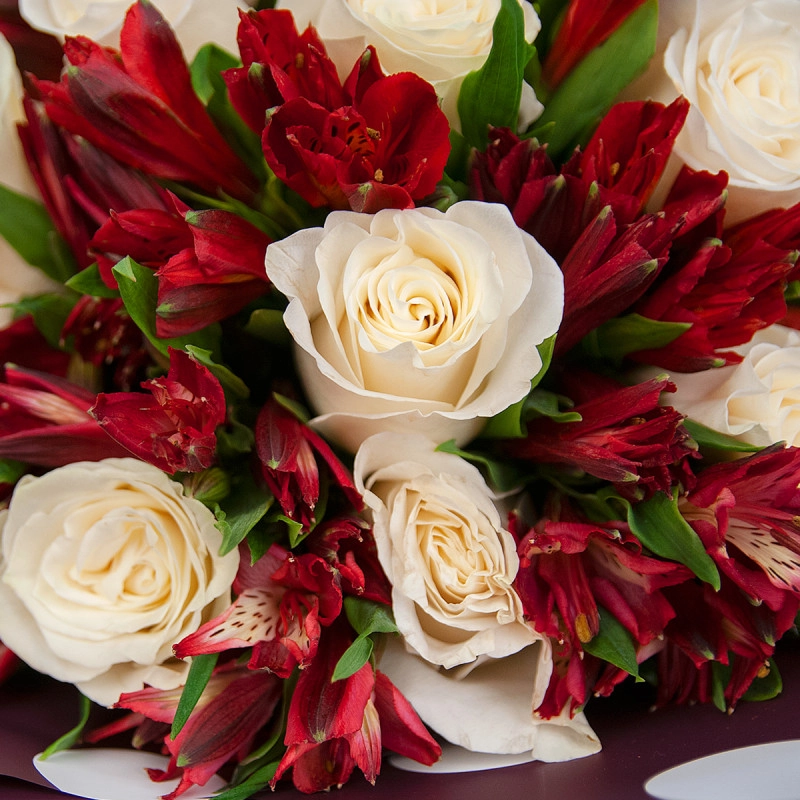Букет из белых роз и красных альстромерий – гармония страсти и чистоты