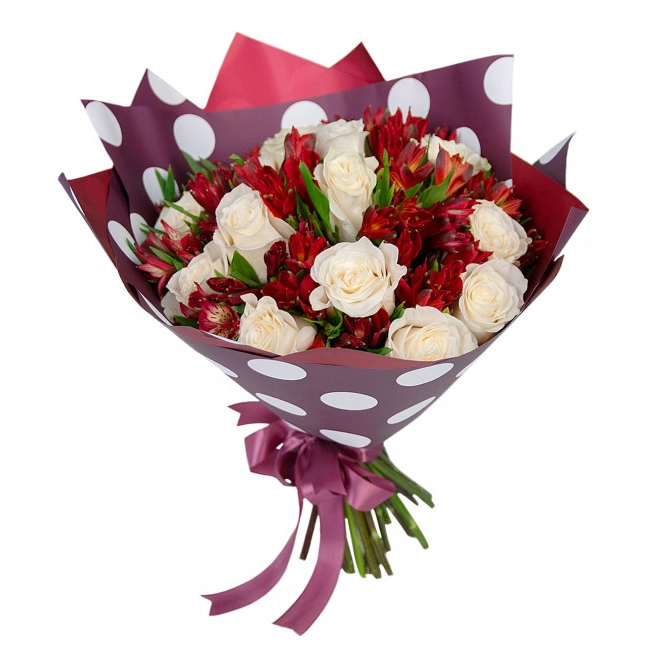 Контрастный букет сочетает нежные белые розы и яркие красные альстромерии.