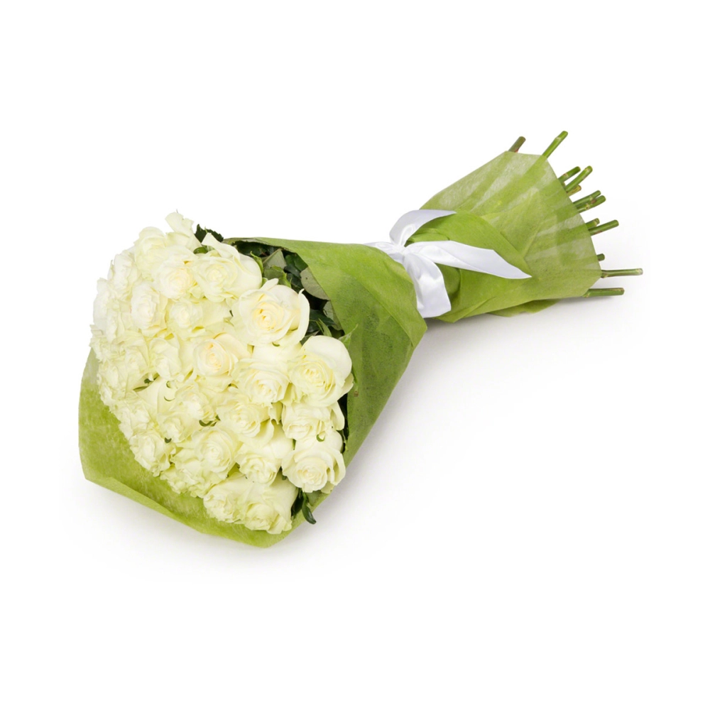 Элегантный букет из белоснежных роз в благородной фетровой упаковке — воплощение чистоты и божественной гармонии.