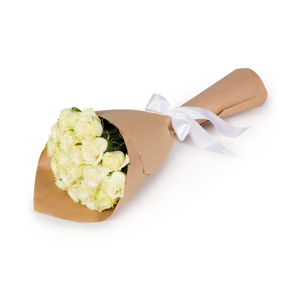 Изысканный букет из 7 белоснежных роз в стильной крафтовой упаковке — воплощение чистоты и совершенства.