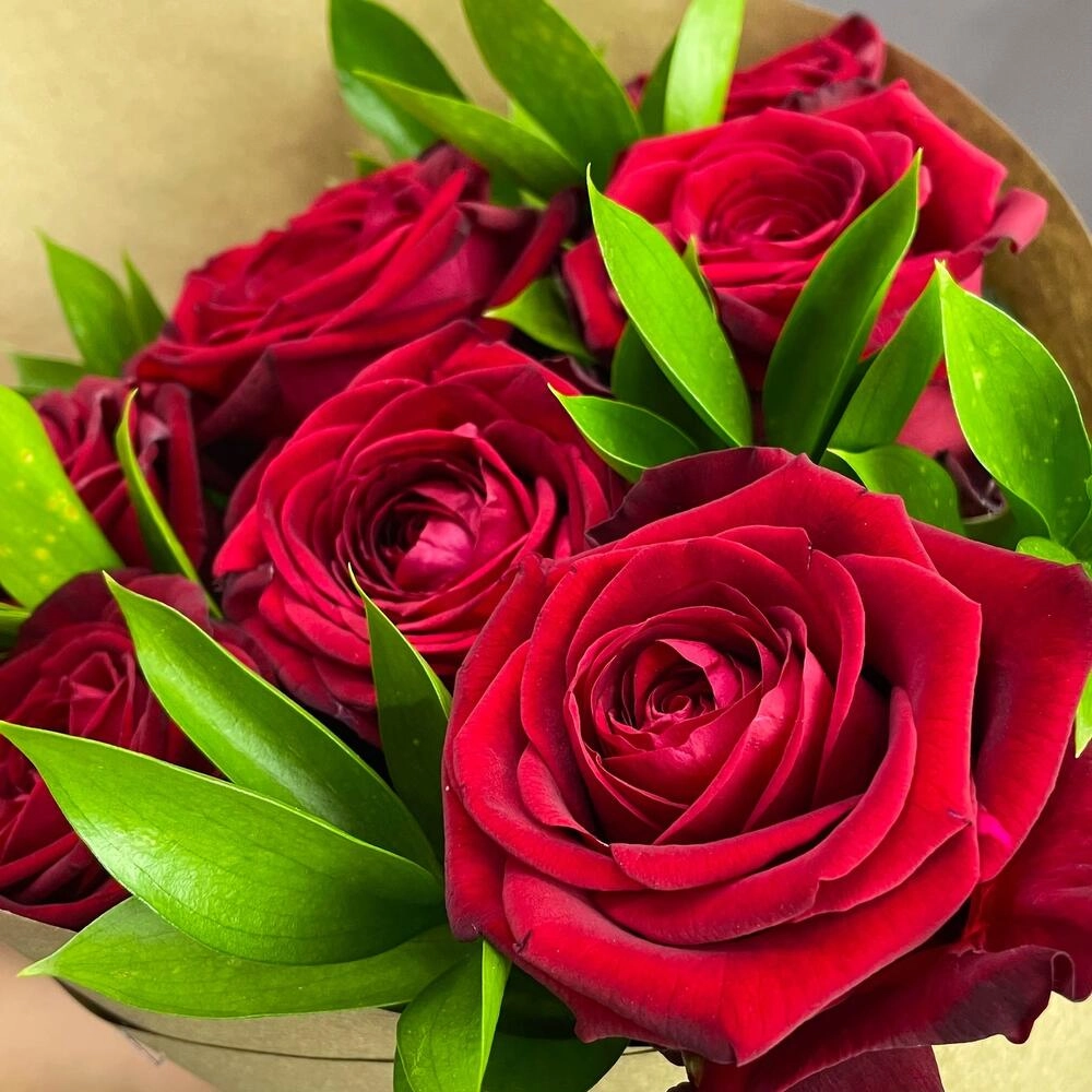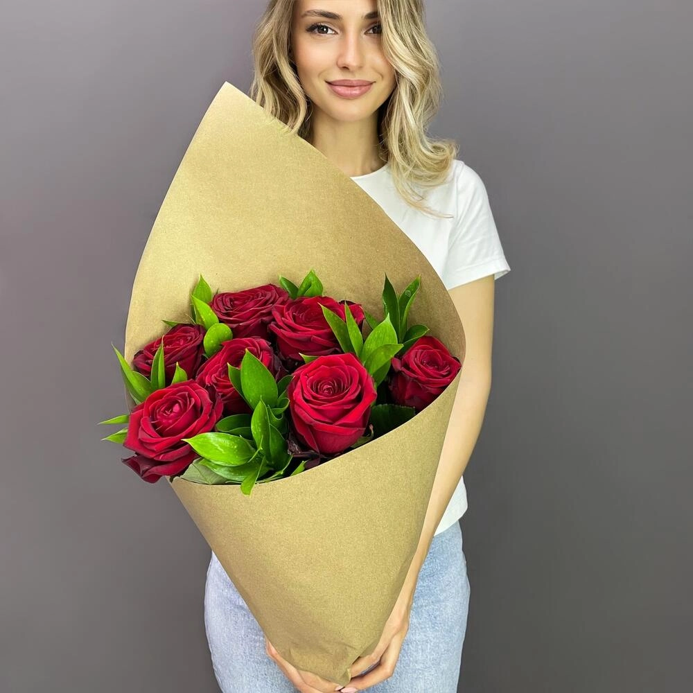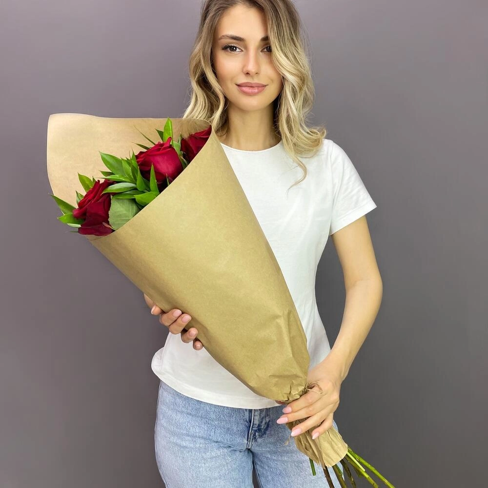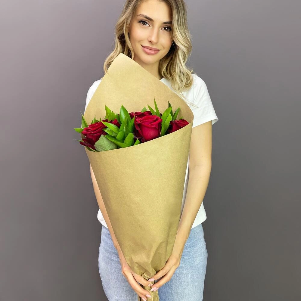 Букет из красных роз с рускусом в крафтовой упаковке – классика с изюминкой