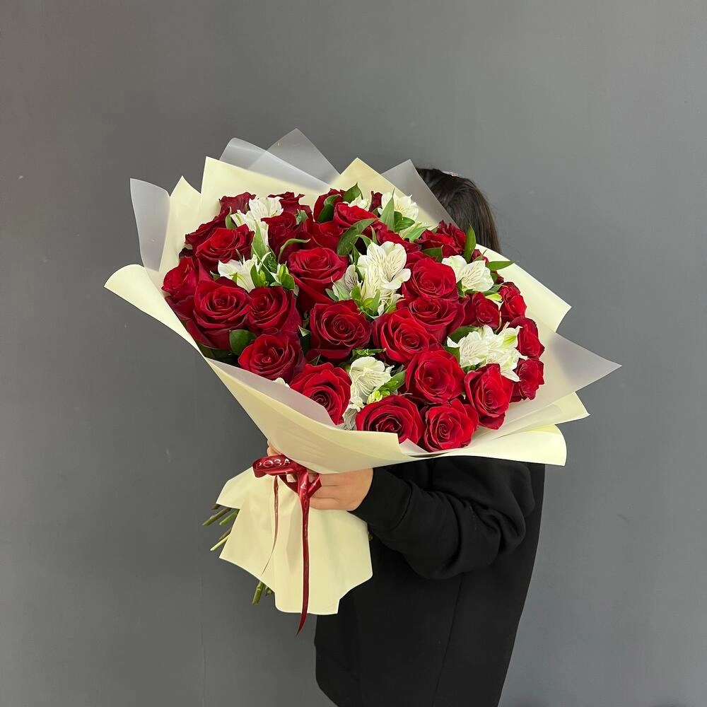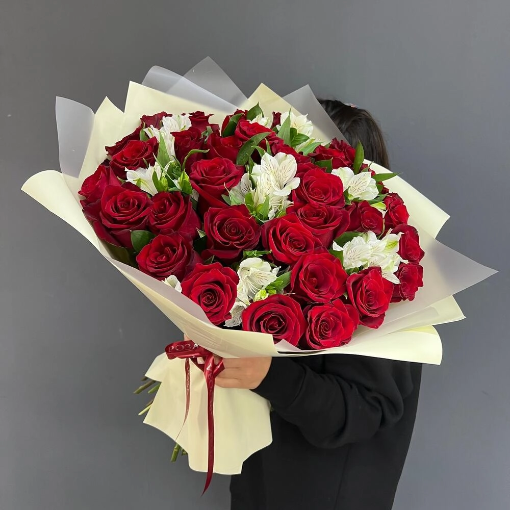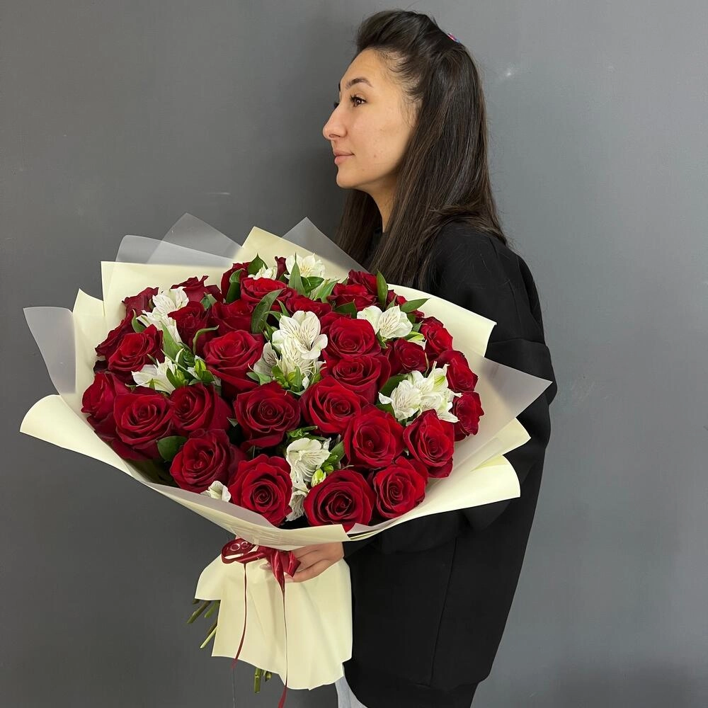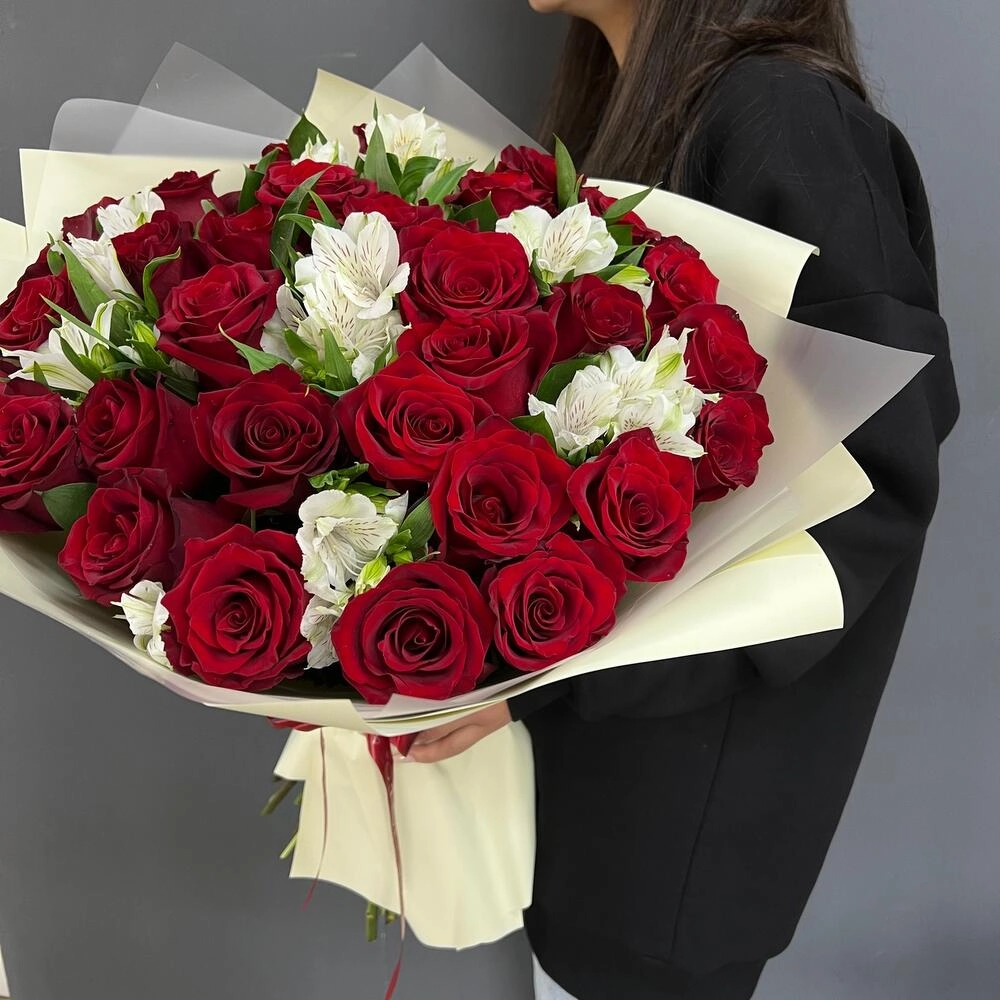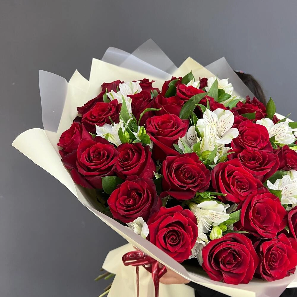 Волнующая композиция из алых роз и белоснежных альстромерий — воплощение совершенной любви. Идеальный выбор для романтического признания или годовщины отношений. Заказать букет цветов с доставкой в Климовске.