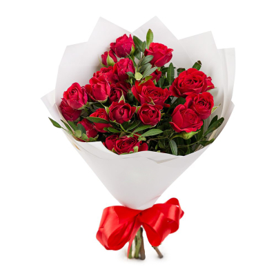 Утонченная композиция из 5 красных кустовых роз с фисташковой зеленью — воплощение страсти и свежести. Идеальный выбор для романтического подарка. Доставка роз Климовск от Афло.