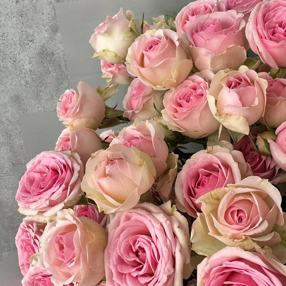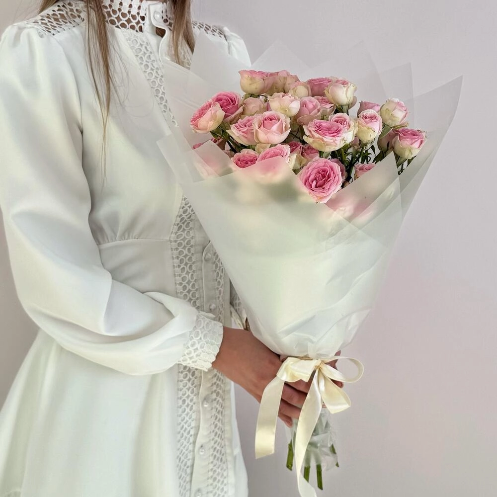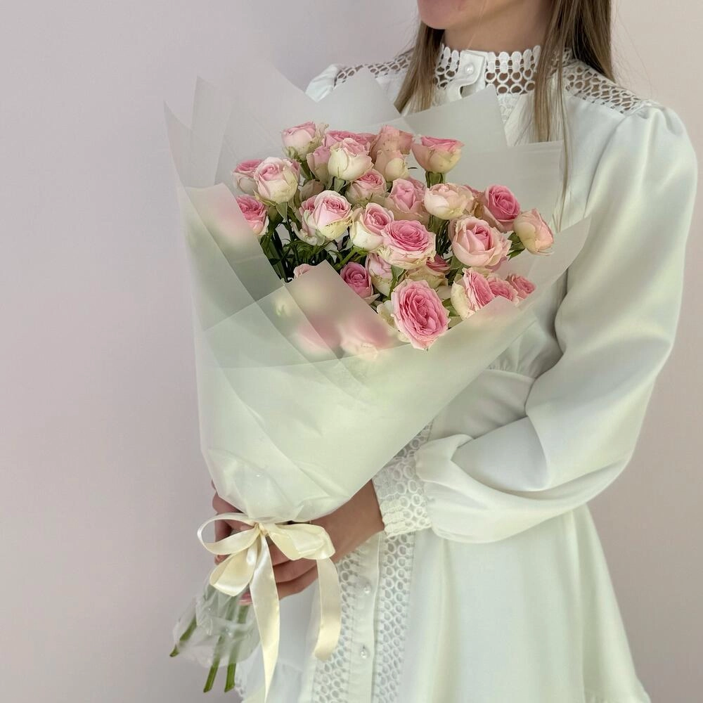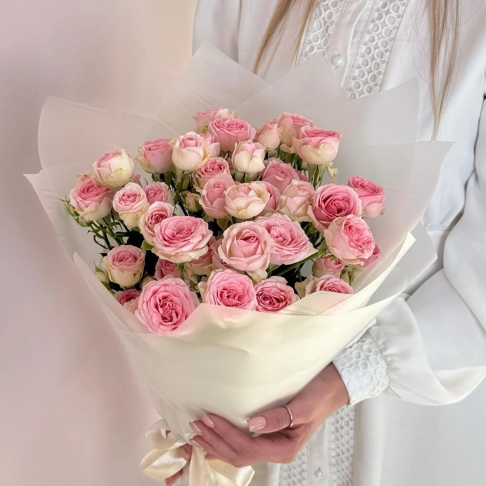 Роскошный букет «Нежный аромат» из кустовых розовых роз в дизайнерской упаковке — воплощение изысканности и хорошего вкуса.