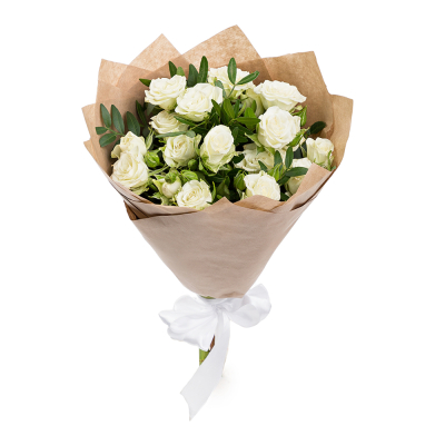 Нежная композиция из 5 белоснежных кустовых роз с фисташковой зеленью — воплощение чистоты и свежести.