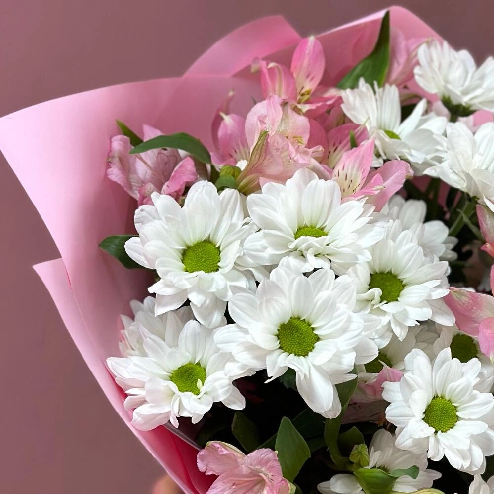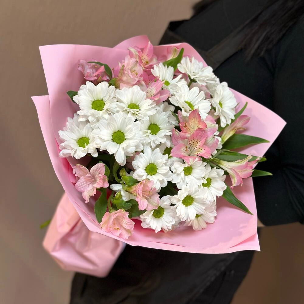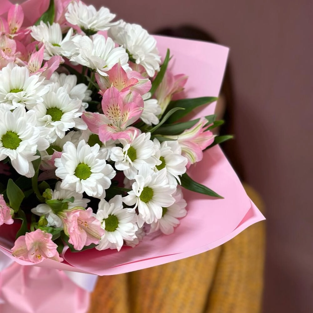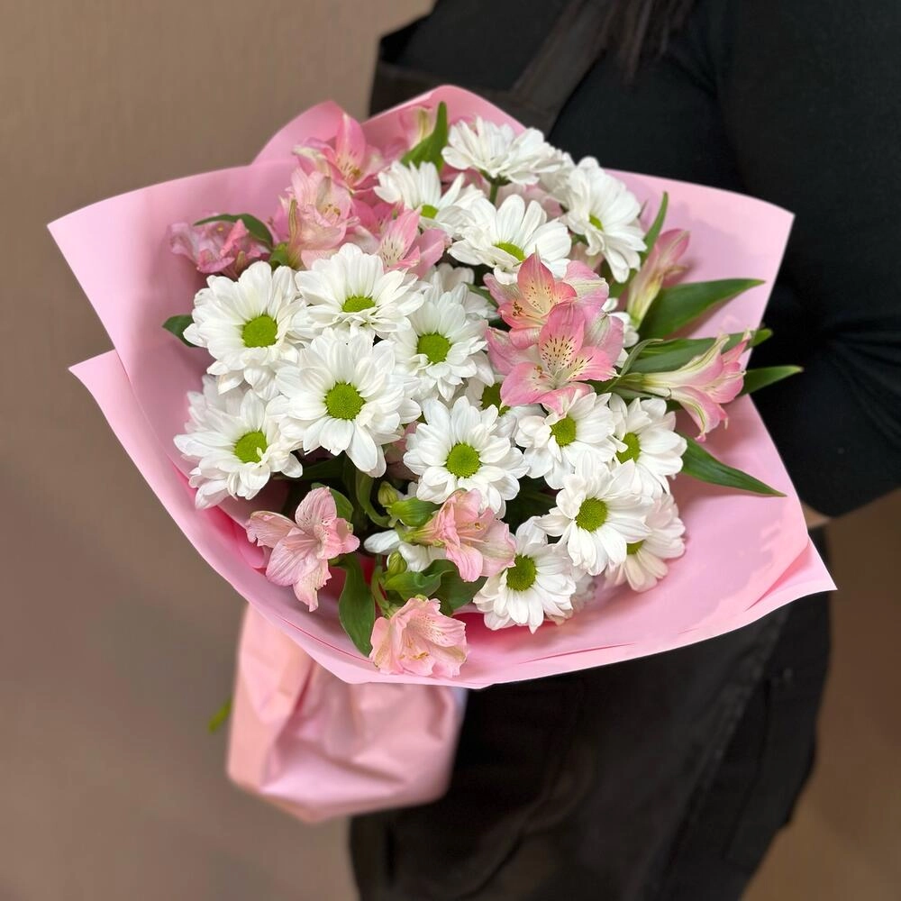 Воздушный букет «Поцелуй бабочки» сочетает белоснежные хризантемы и нежно-розовые альстромерии, создавая образ лёгкости и трепетной красоты.
