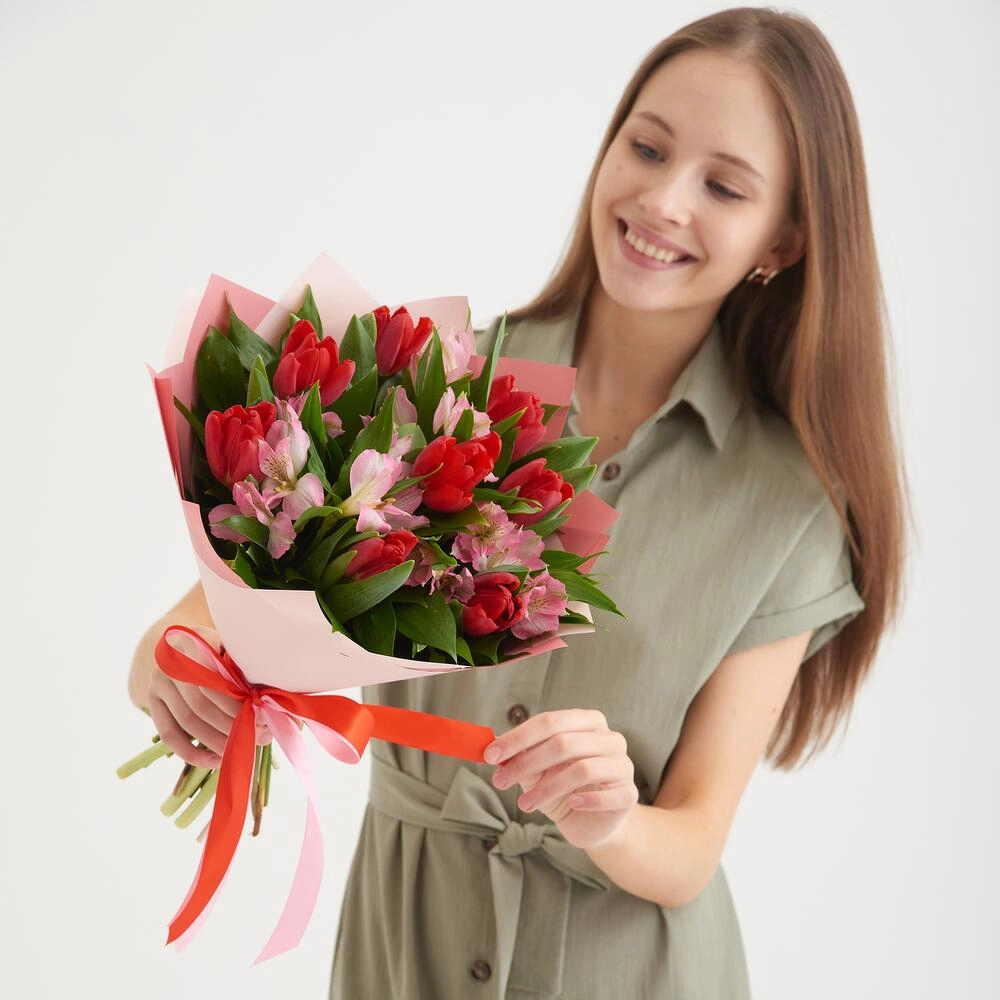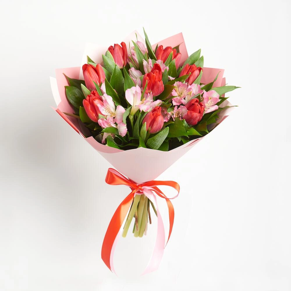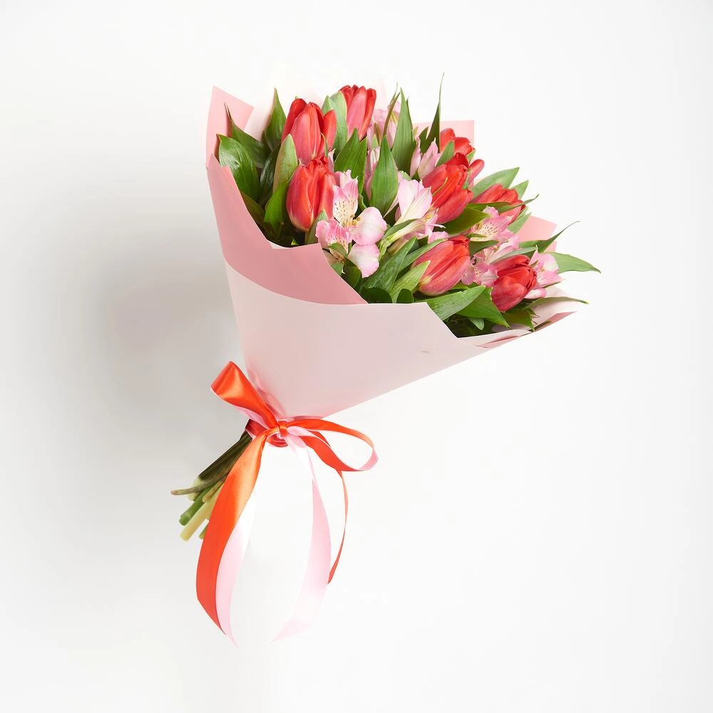 Яркий и очаровательный букет из красных тюльпанов и розовых альстромерий. Этот очаровательный букет станет прекрасным комплиментом на любое торжество!