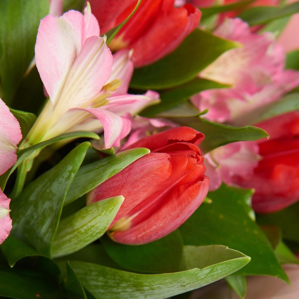 Букет «Первый поцелуй» красных тюльпанов и розовых альстромерий