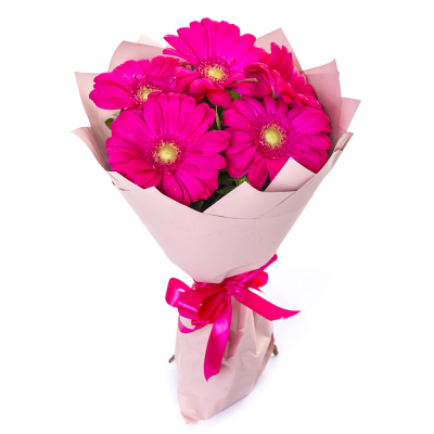 Нежная композиция из 5 свежих малиновых гербер — воплощение теплых чувств и искренности. Идеальный выбор для небольшого, но выразительного подарка.