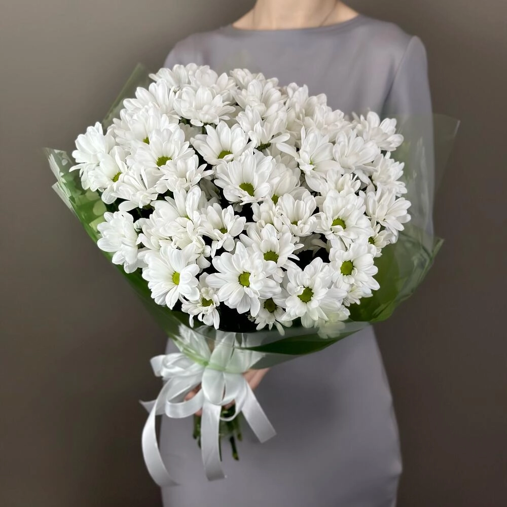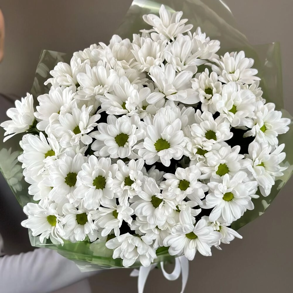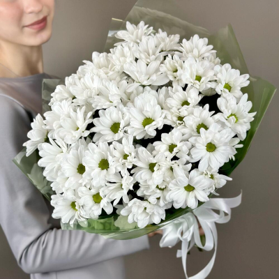 Воздушный букет «Мечты о лете» из белоснежных кустовых хризантем напоминает о теплых летних днях.