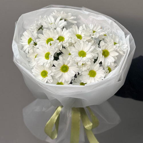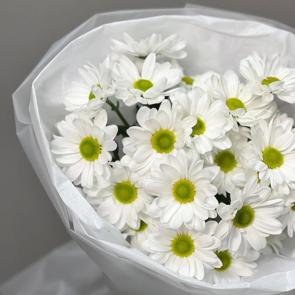 Очаровательный букет «Ромашковый» из белоснежных кустовых хризантем напоминает летнее поле. Эти пышные цветы с нежными лепестками создают атмосферу тепла и уюта. Идеальный выбор для подарка близкому человеку или украшения интерьера.
