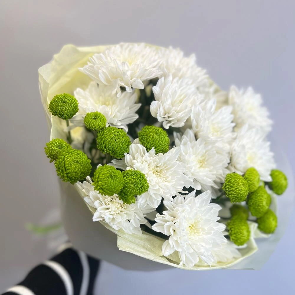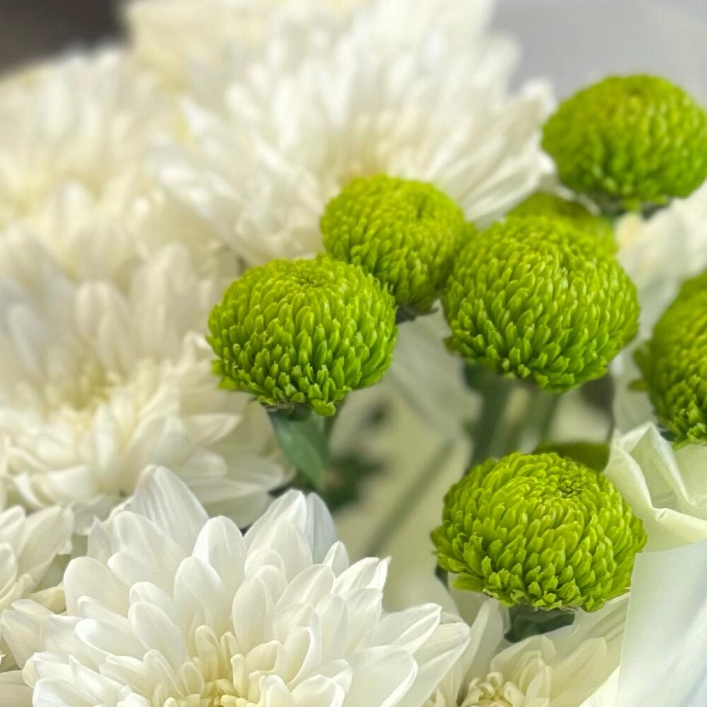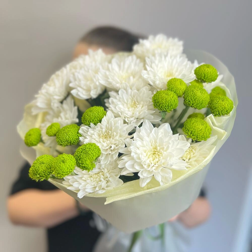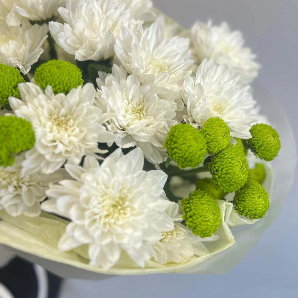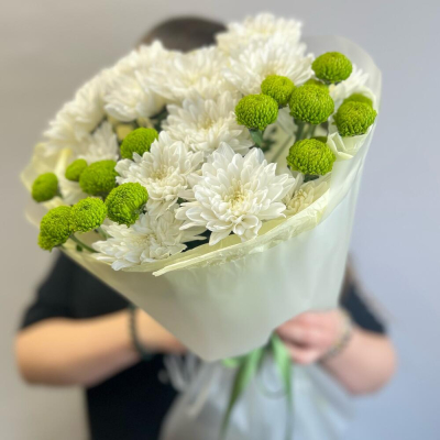 Уникальная композиция из белоснежных кустовых хризантем и редких зеленых «Филин Грин» — воплощение свежести и элегантности. Идеальный выбор для ценителей необычных цветочных решений. Букет цветов с доставкой Климовск.