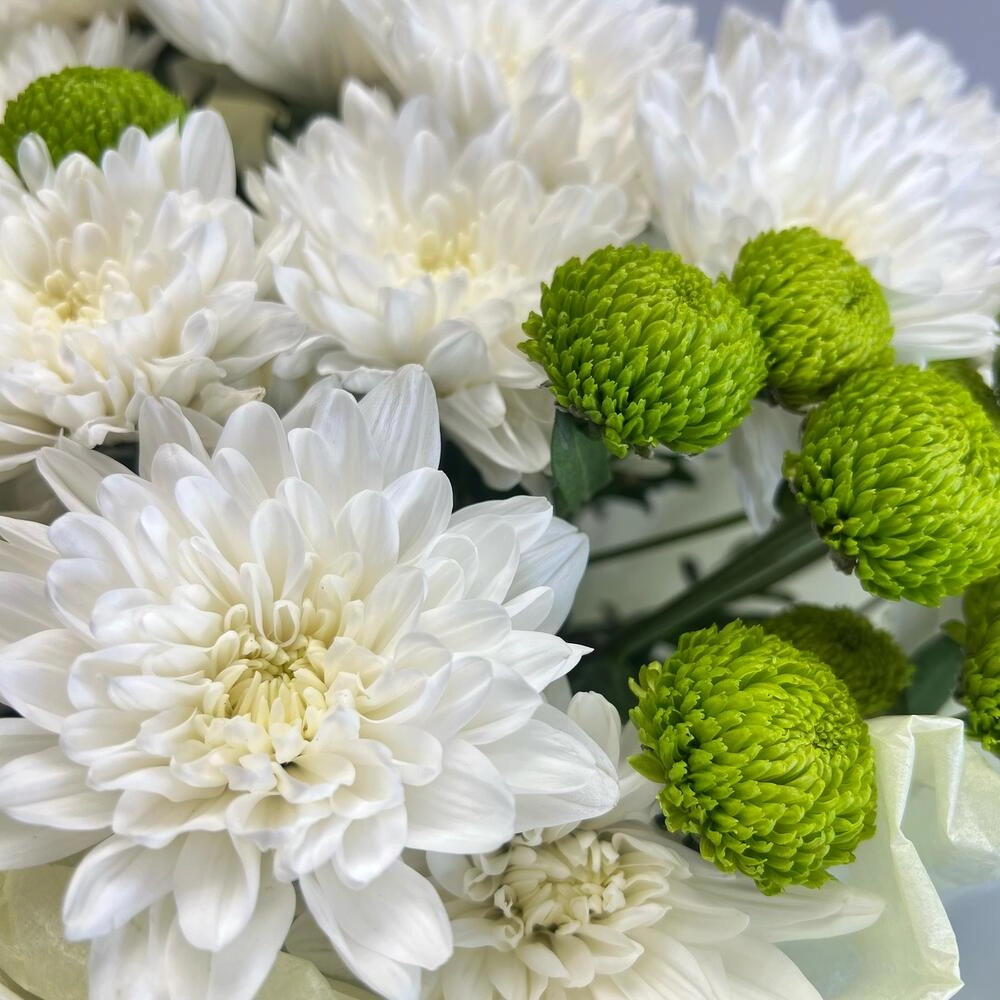 Уникальная композиция из белоснежных кустовых хризантем и редких зеленых «Филин Грин» — воплощение свежести и элегантности.