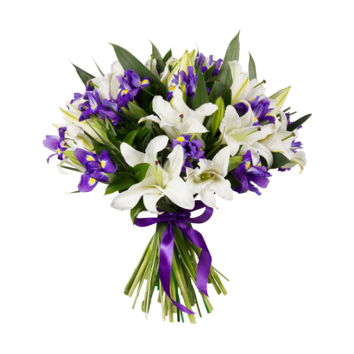Букет Малый из белых лилий и голубых ирисов – гармония нежности и легкости