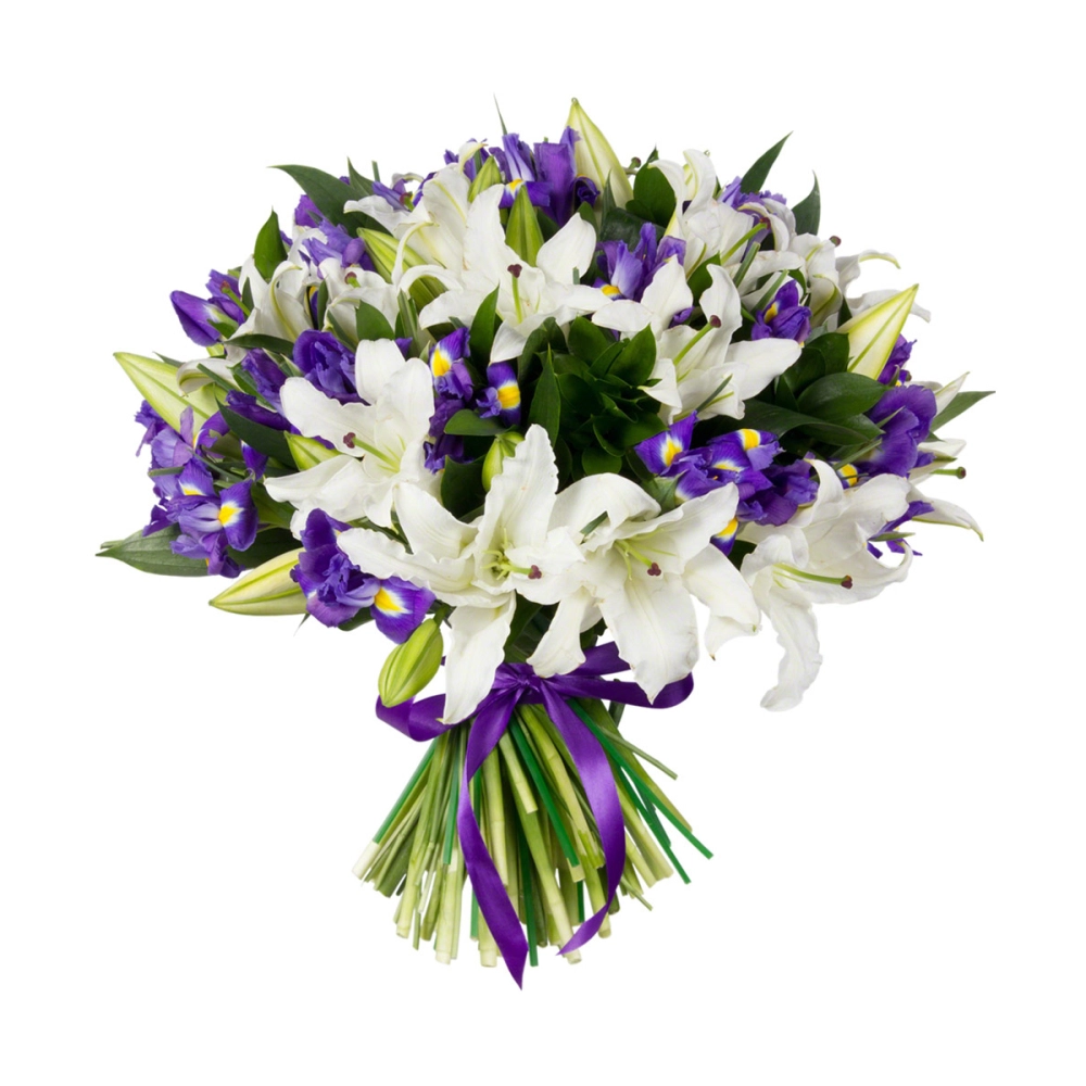 Букет Большой из белых лилий и голубых ирисов – гармония нежности и легкости