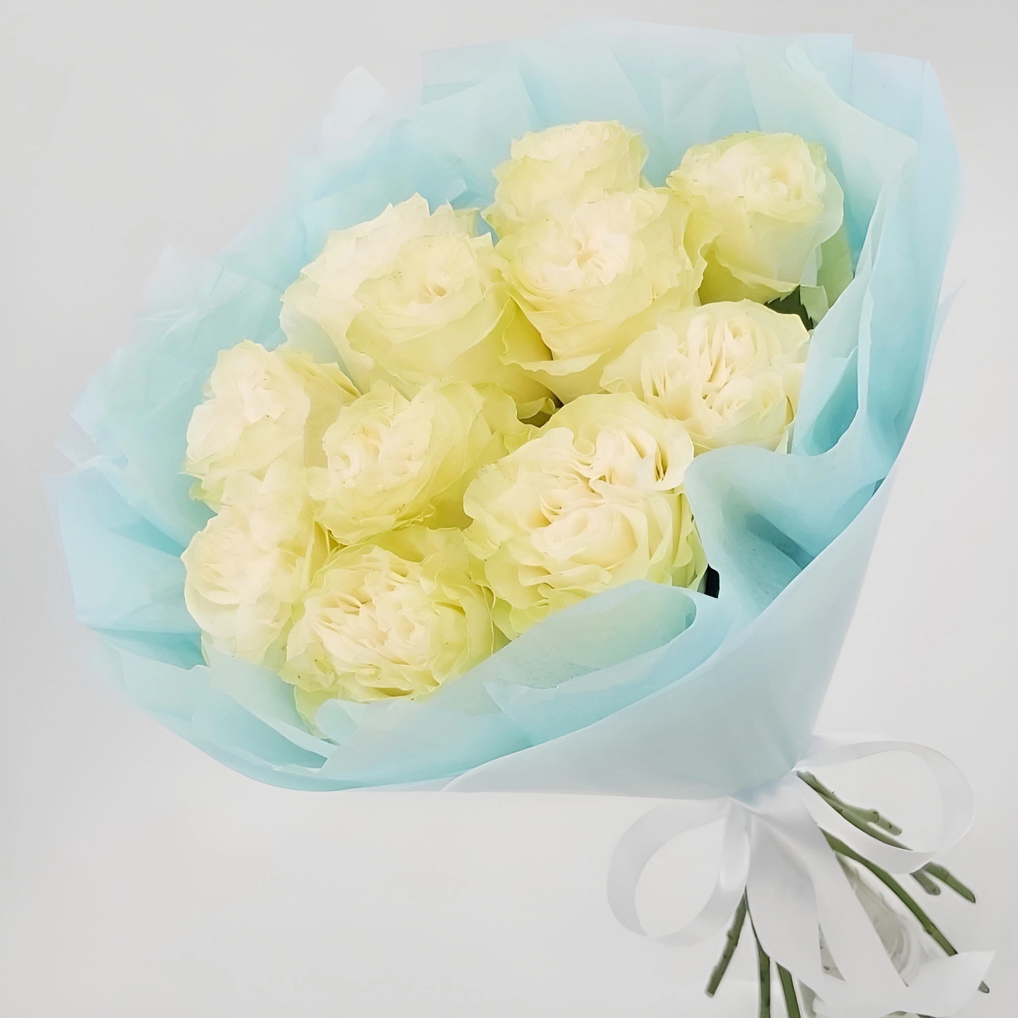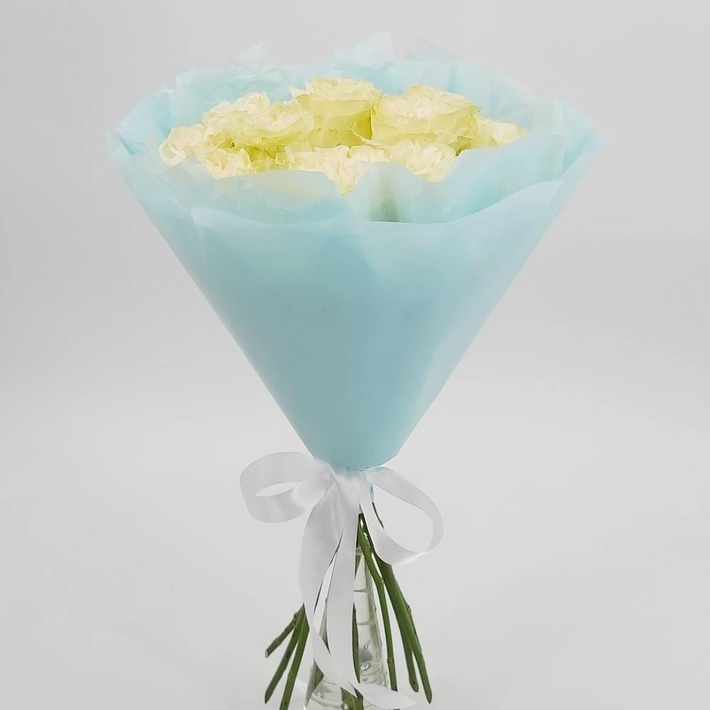 Воздушная композиция из 11 белоснежных эквадорских роз в обрамлении матовой плёнки и нежного тишью. Символ чистоты и невинности. Идеальный выбор для свадьбы, крещения или романтического признания. Заказать цветы с доставкой на дом Климовск.